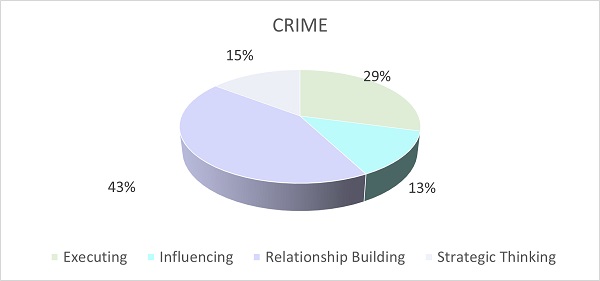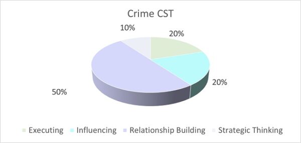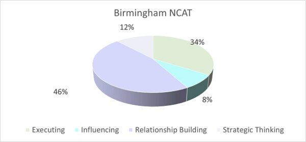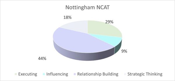 • Influencing has the lowest representation across the three large core teams and the Operational Leadership Team. This is in line with results observed across public sector teams at all levels within UK public sector organisations.