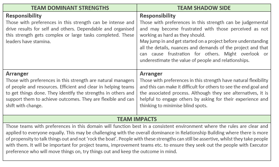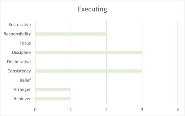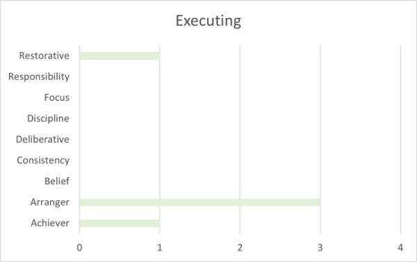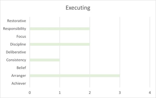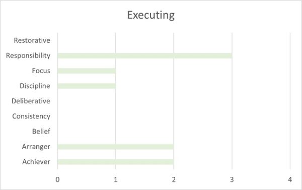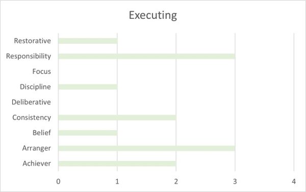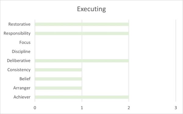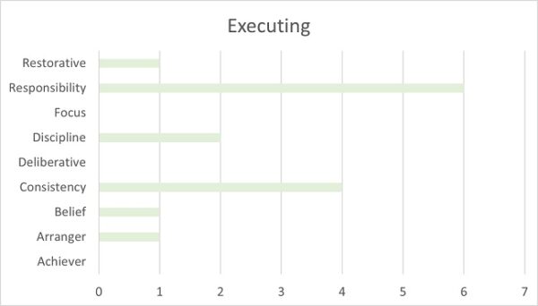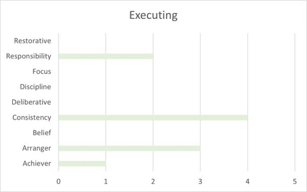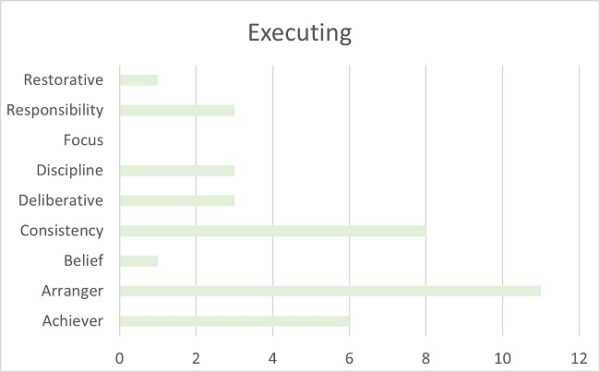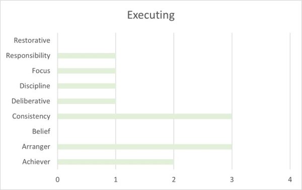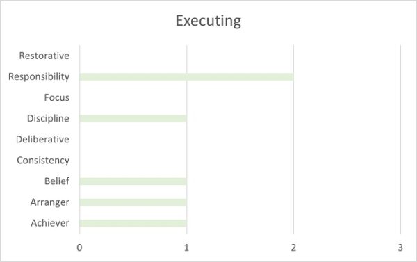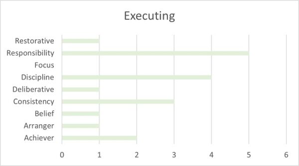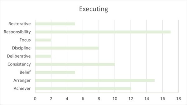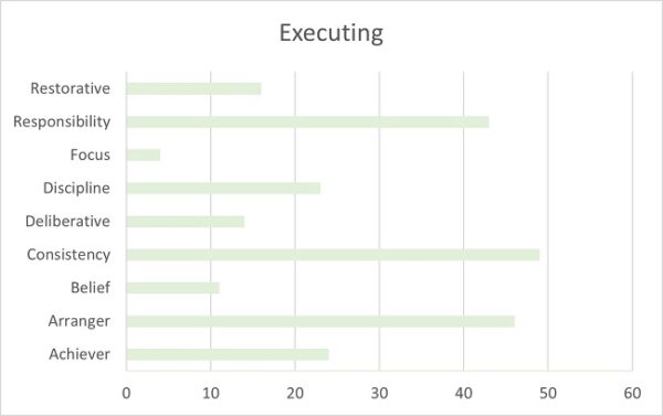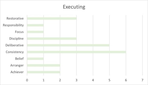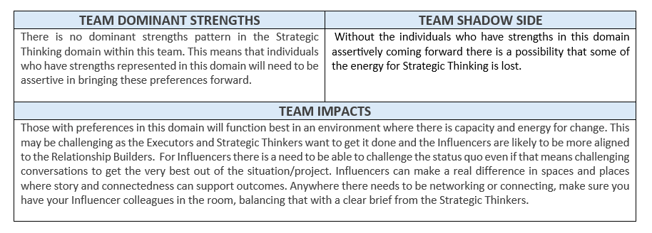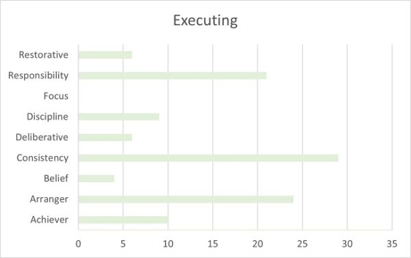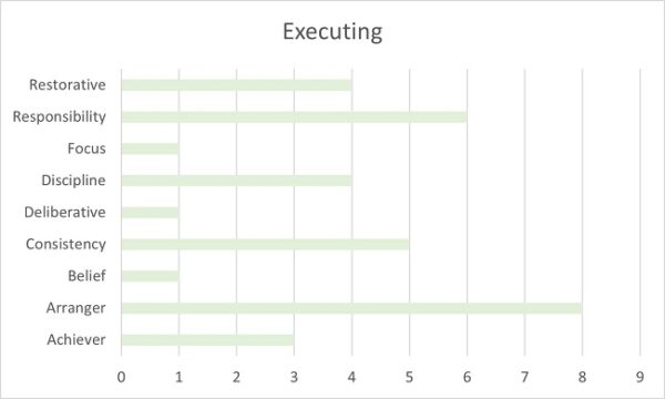 • Executing: Teams that have a dominant strengths profile in this key domain know how to rally around a goal and get things done. Differing strengths might dictate the style of getting to the goal, but teams who have strengths in this area make a massive contribution to things happening.