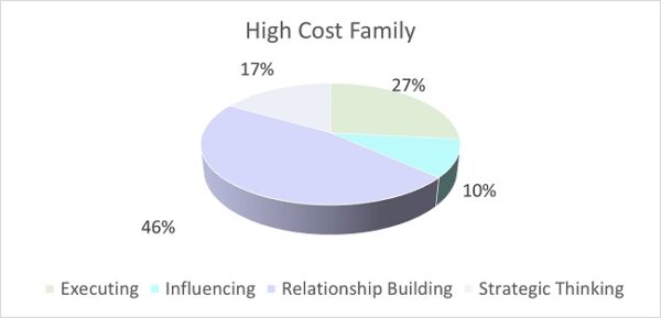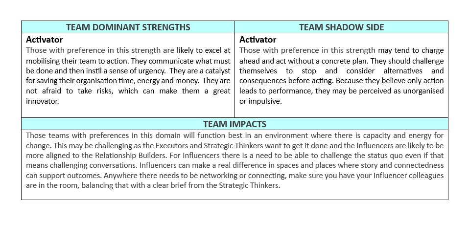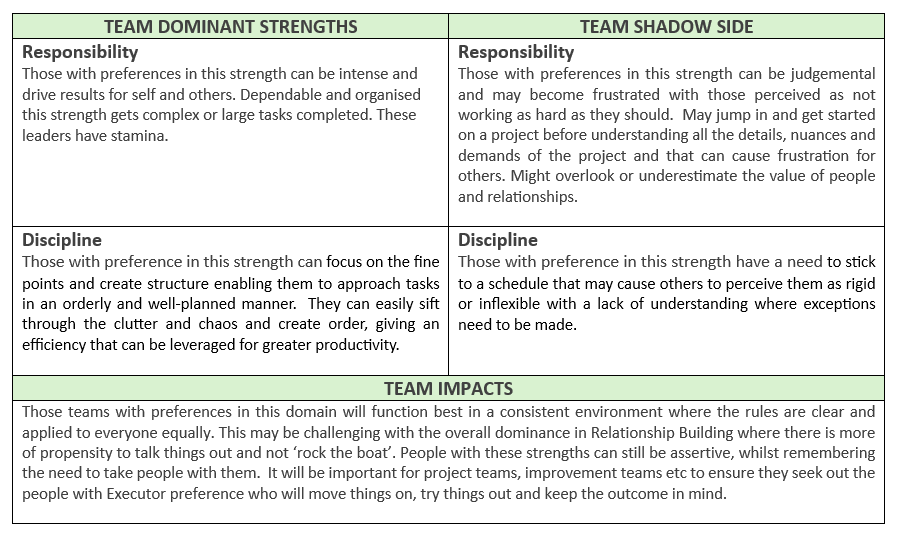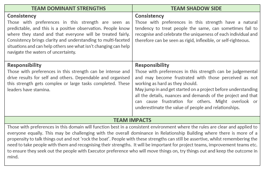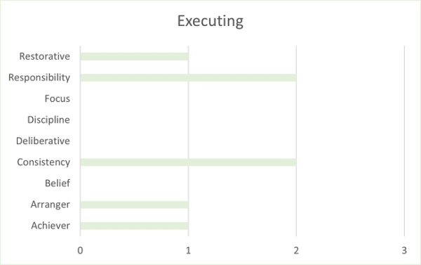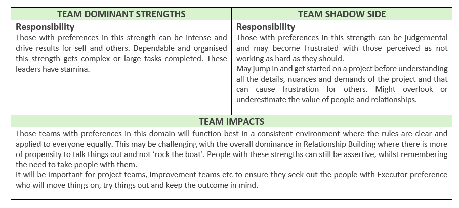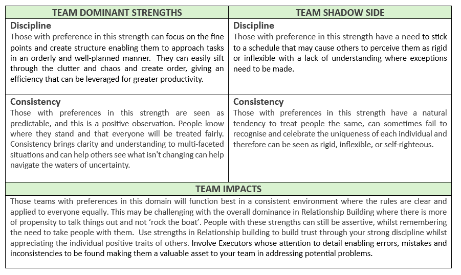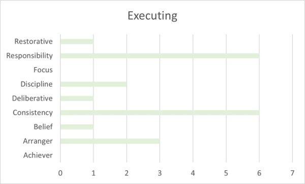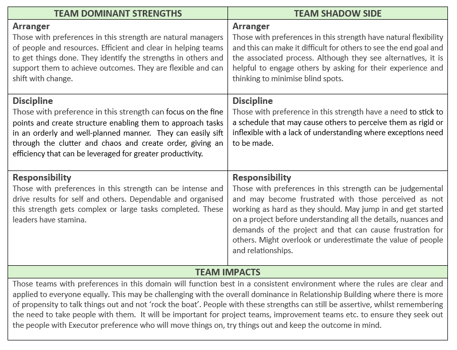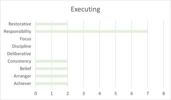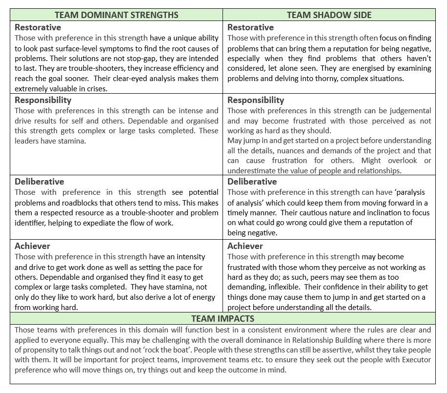 • Executing: Teams that have a dominant strengths profile in this key domain know how to rally around a goal and get things done. Differing strengths might dictate the style of getting to the goal, but teams who have strengths in this area make a massive contribution to things happening.