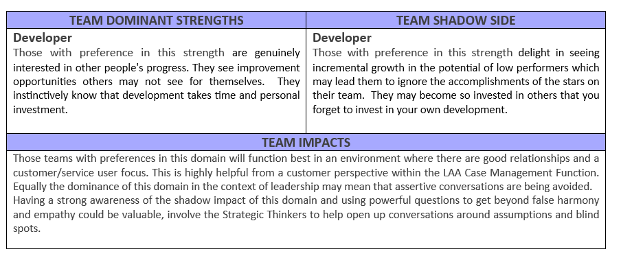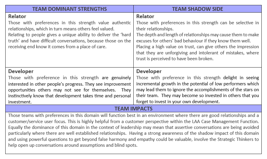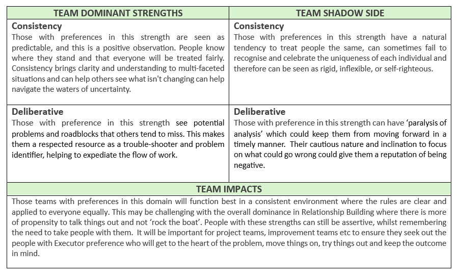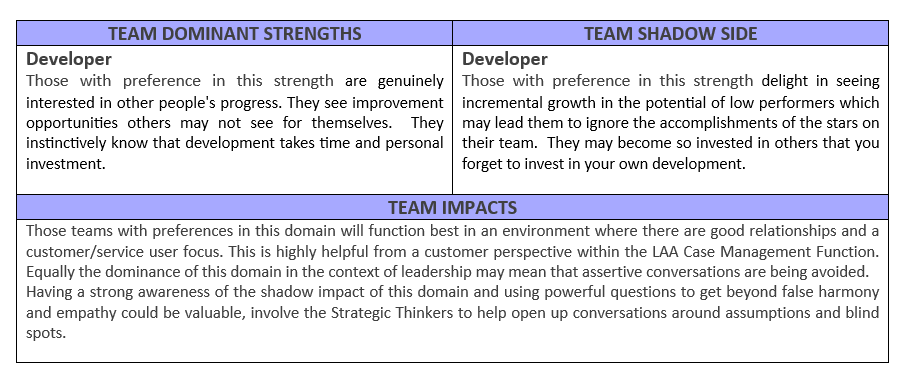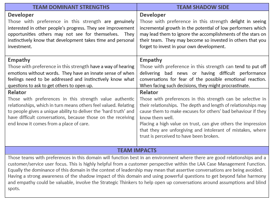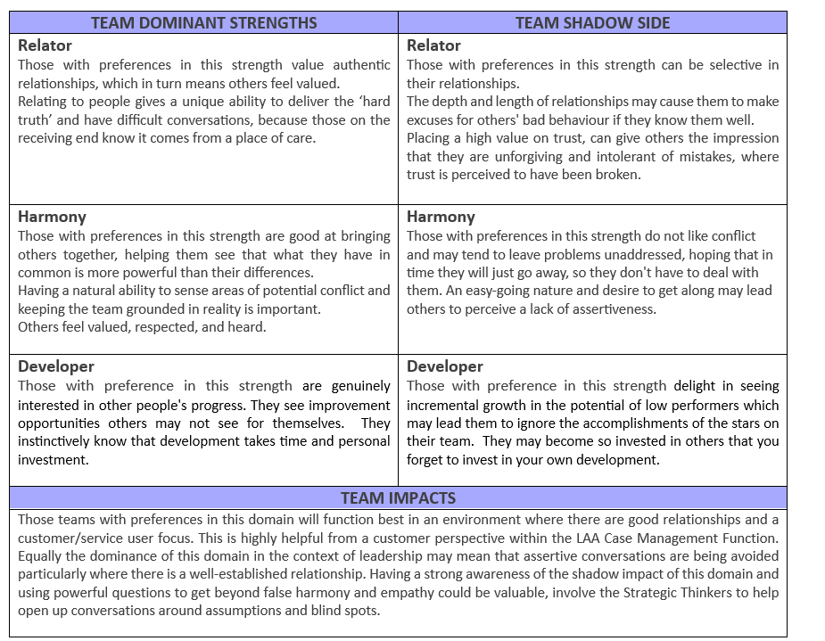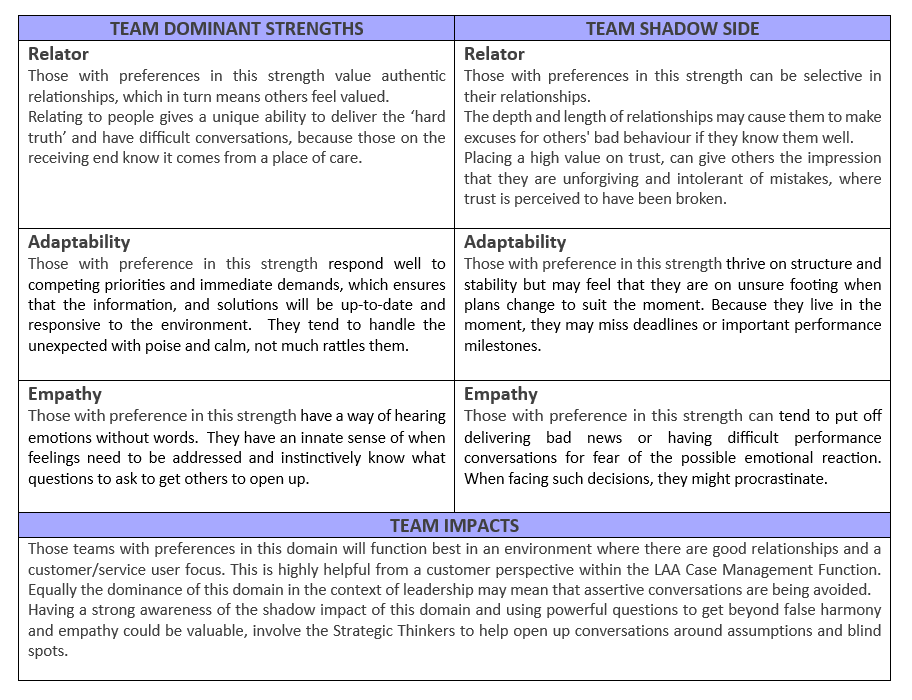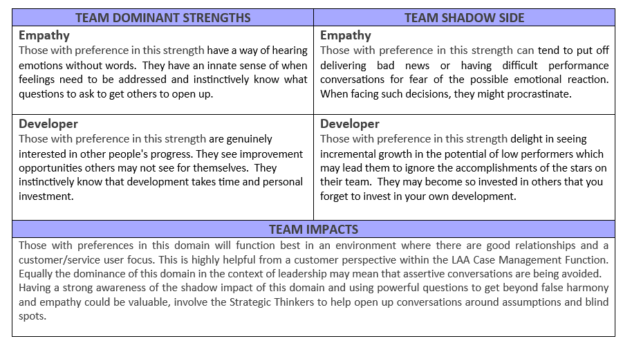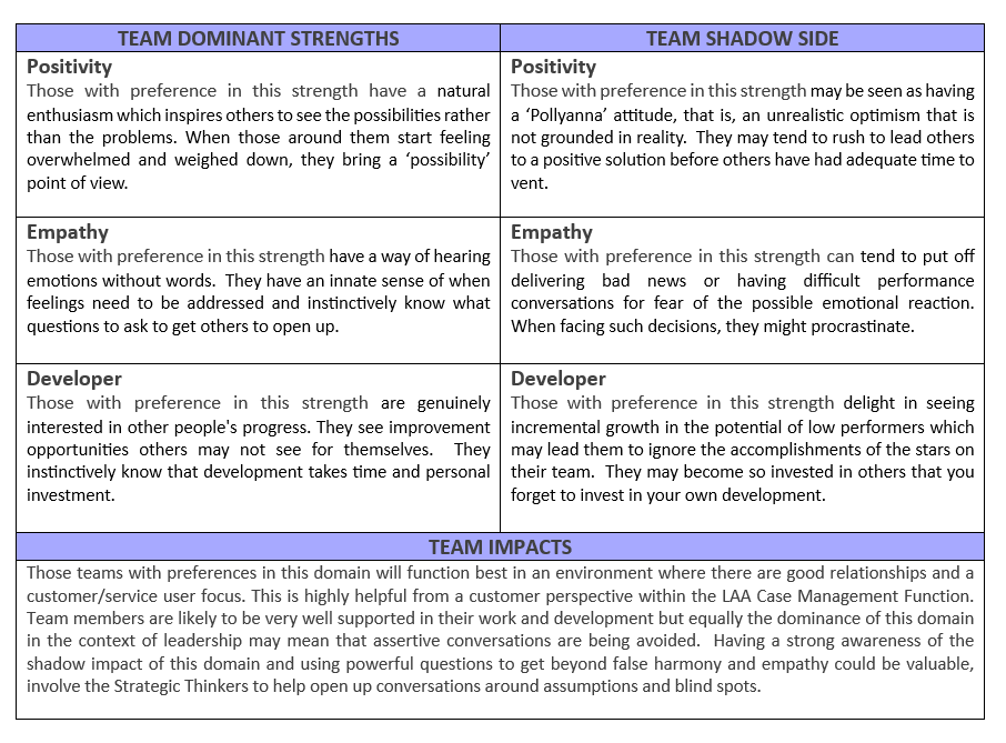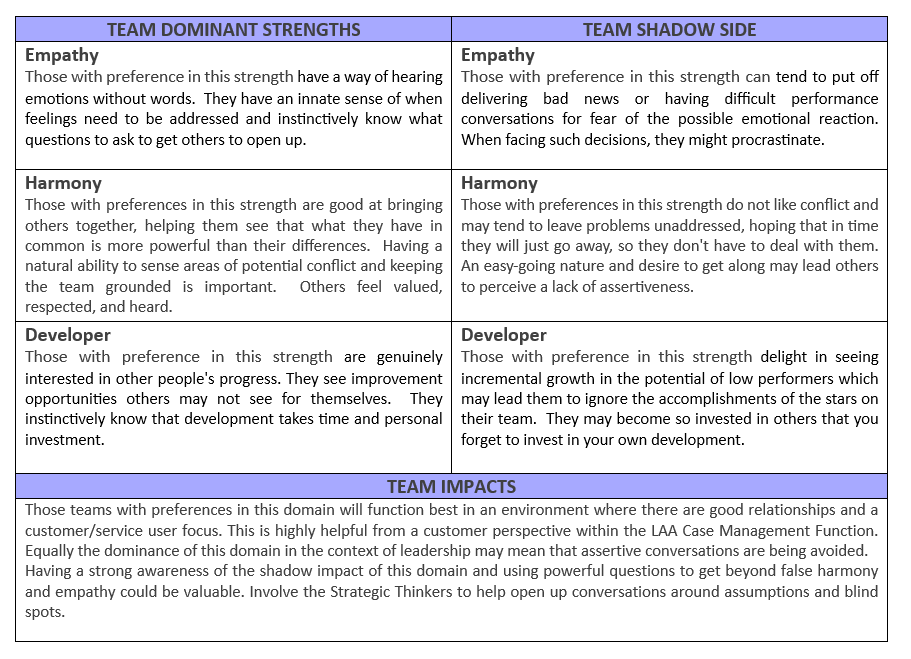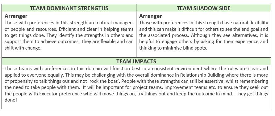 Information and analysis on every team follows this overview. As leaders you can use this to help you to think about how you collectively impact each piece of work that you do. There will be an opportunity for each team to attend a workshop to look at their specific strengths pattern, how to maximise the impact and minimise the shadow side of these.