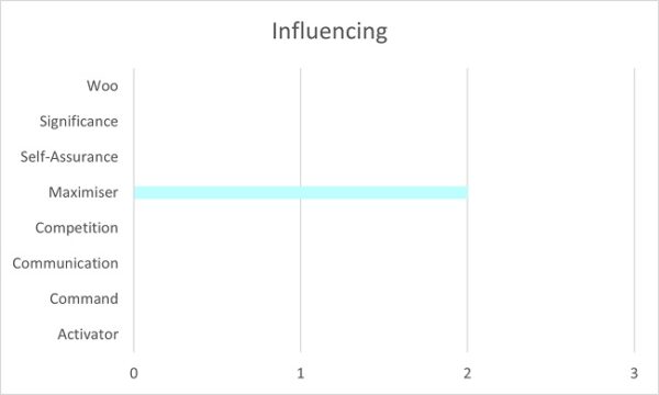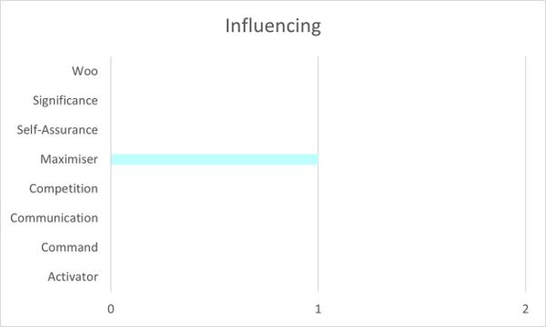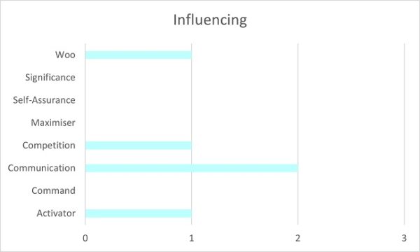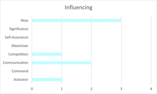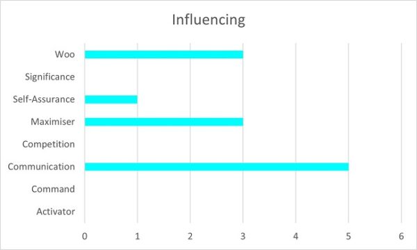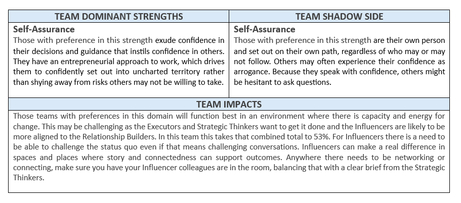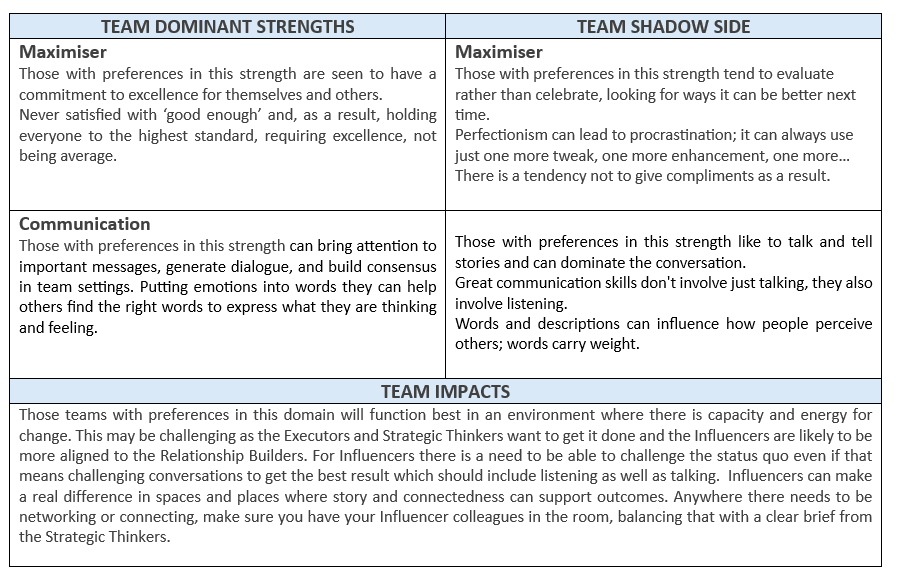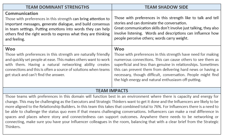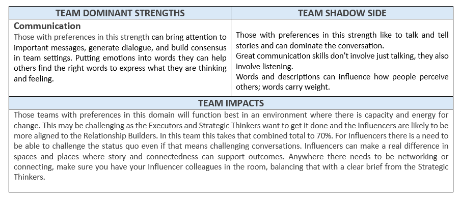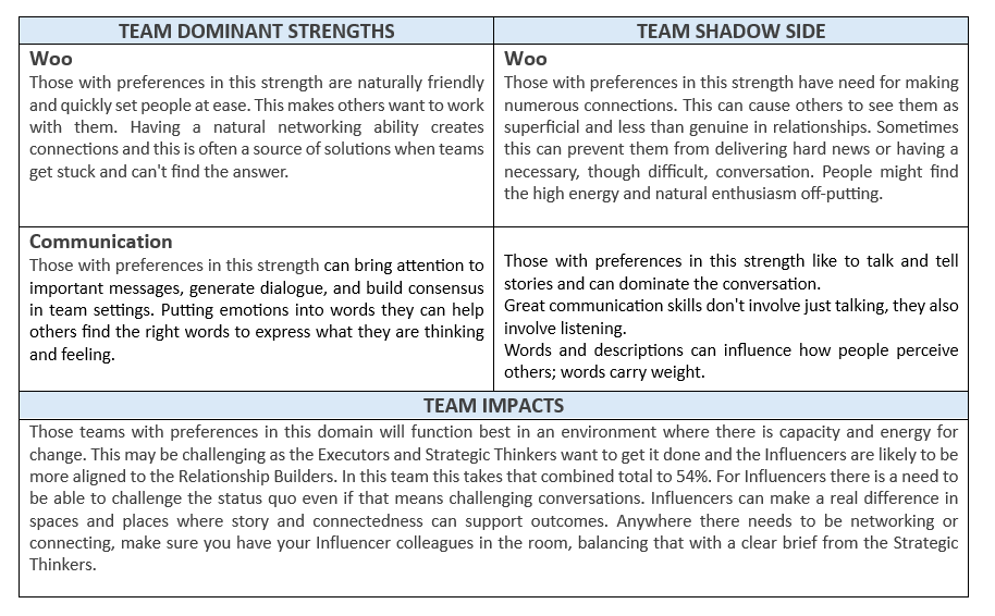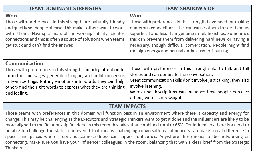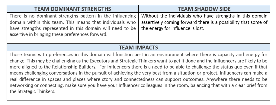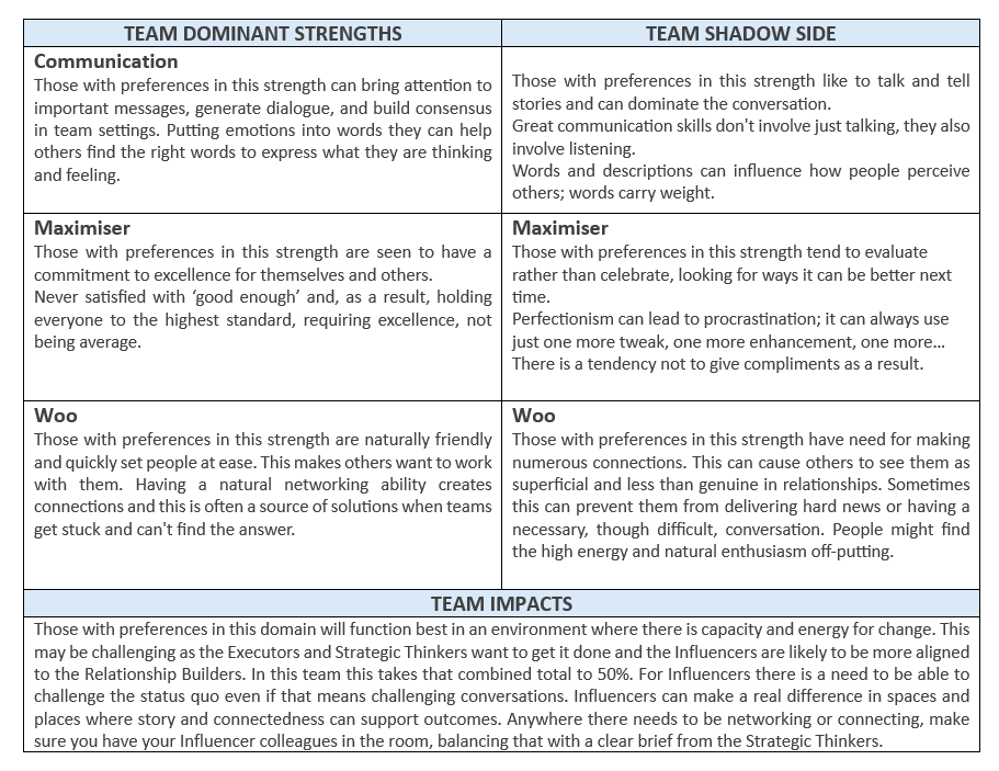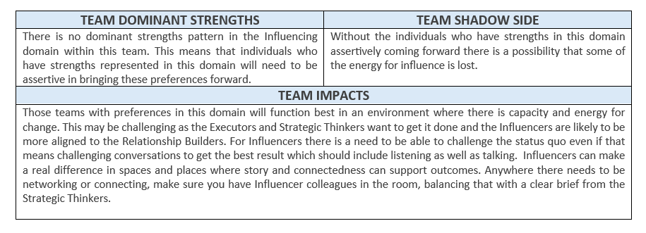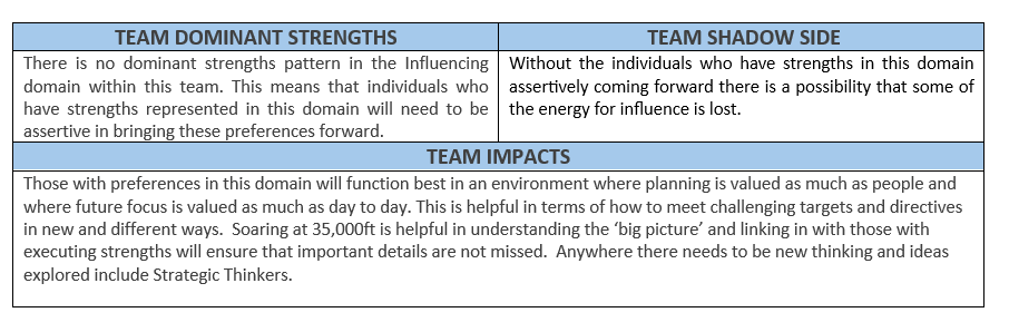 The team profile demonstrates some preference within this domain, Communication, Woo and Maximiser the dominant signature strengths. The majority of influencing will be carried out from the other three domains.