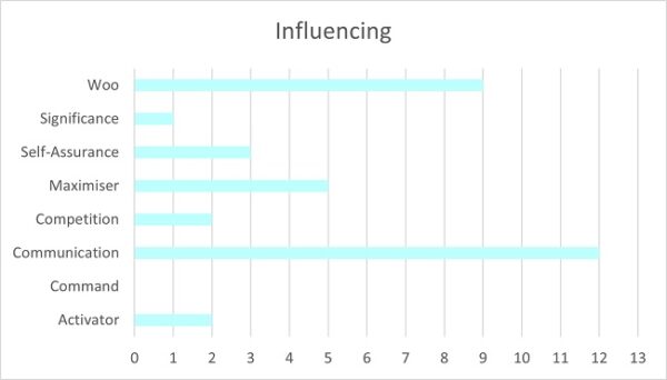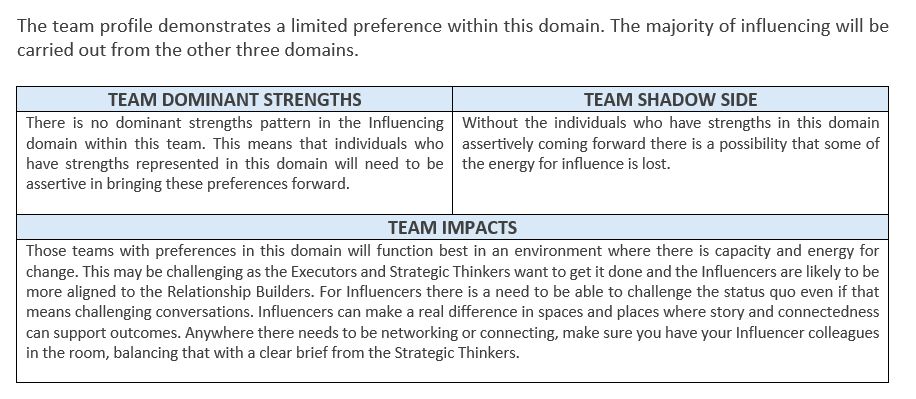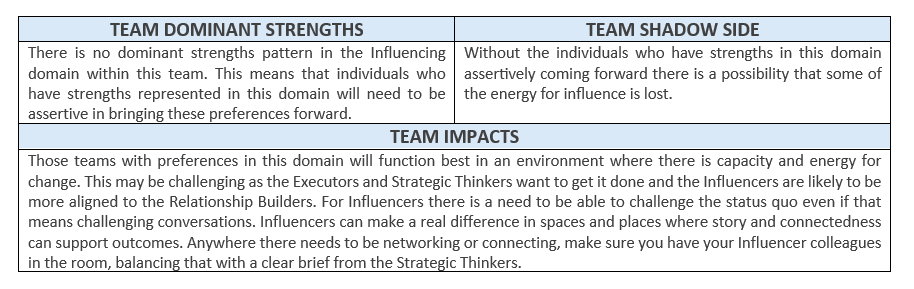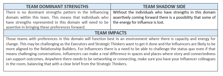 • Influencing: Teams that have a dominant strengths profile in this key domain know how to share and embed the ideas both inside and outside the organisation. These teams are natural persuaders, inspire others to adopt their ideas and are vital to moving forward in communities.