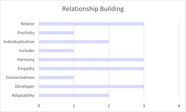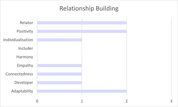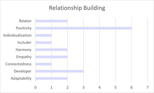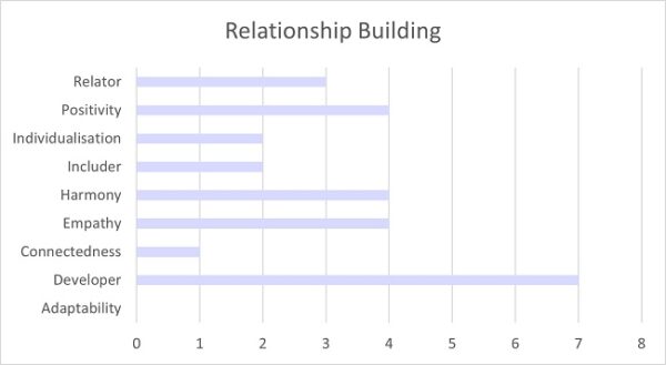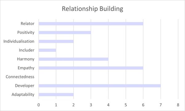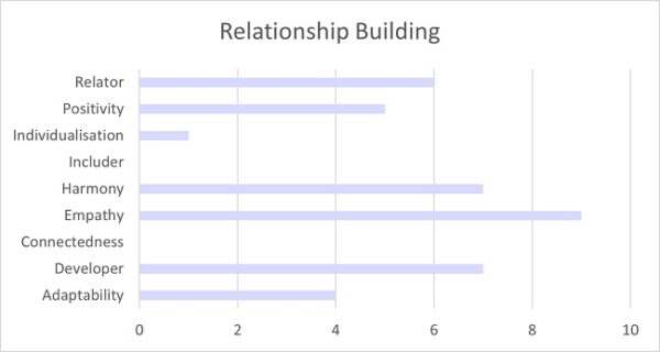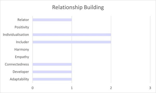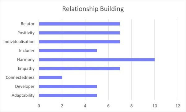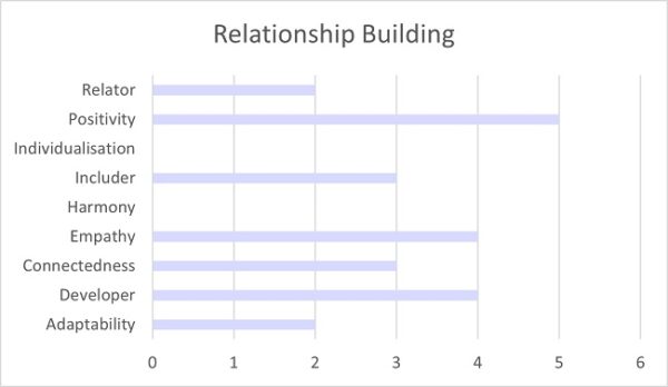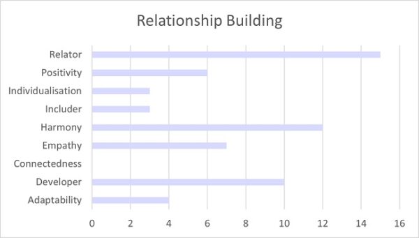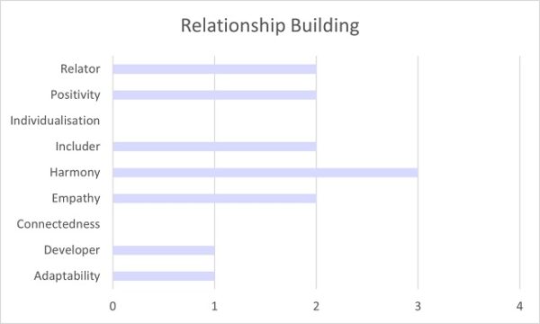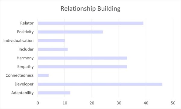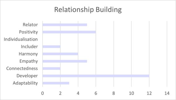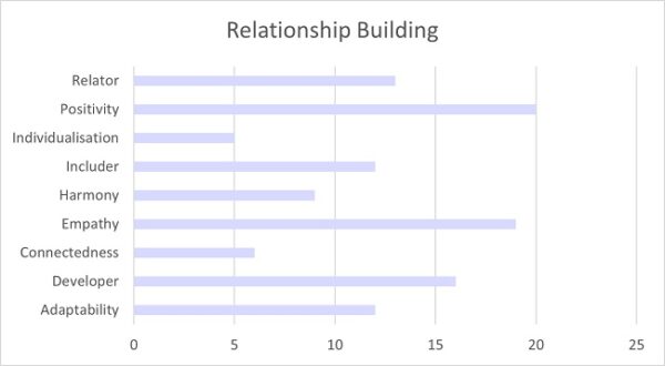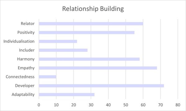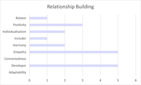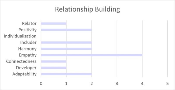 • Within the Relationship Building Domain five out of nine strengths are covered: Empathy/Harmony/Developer/Relator and Positivity.