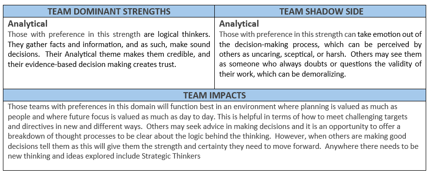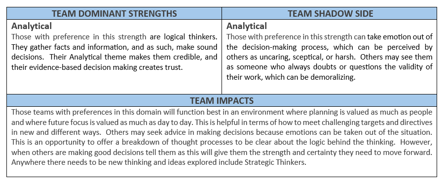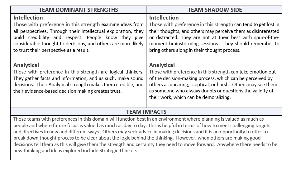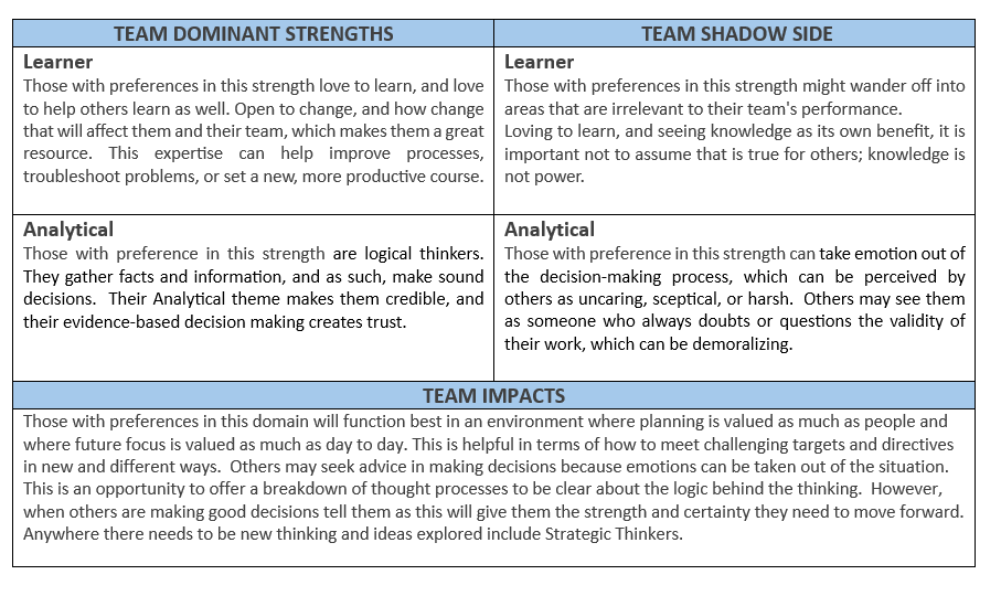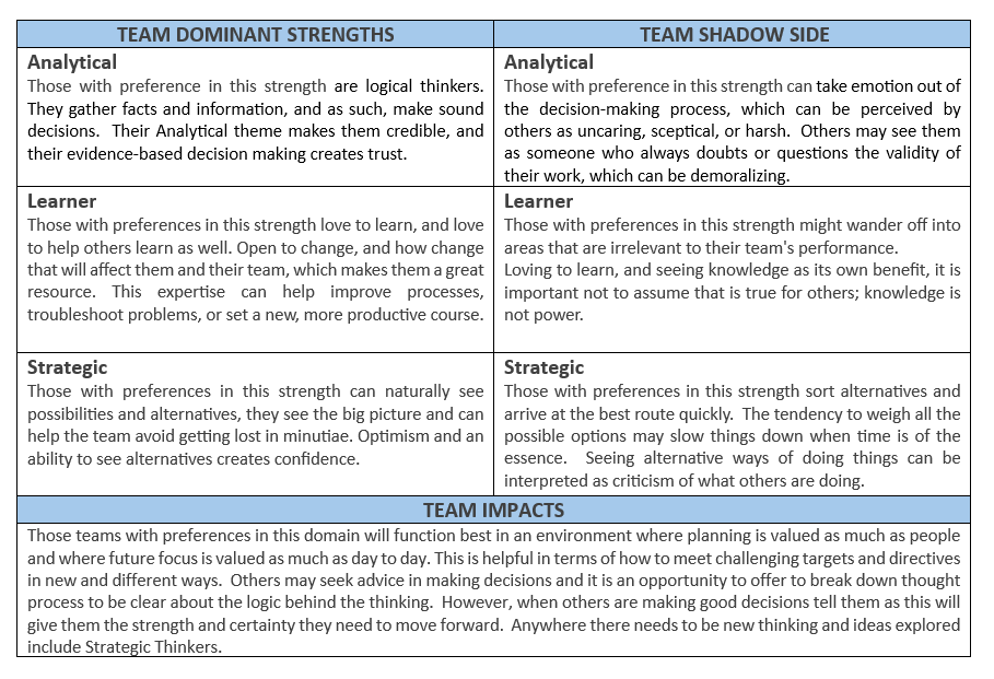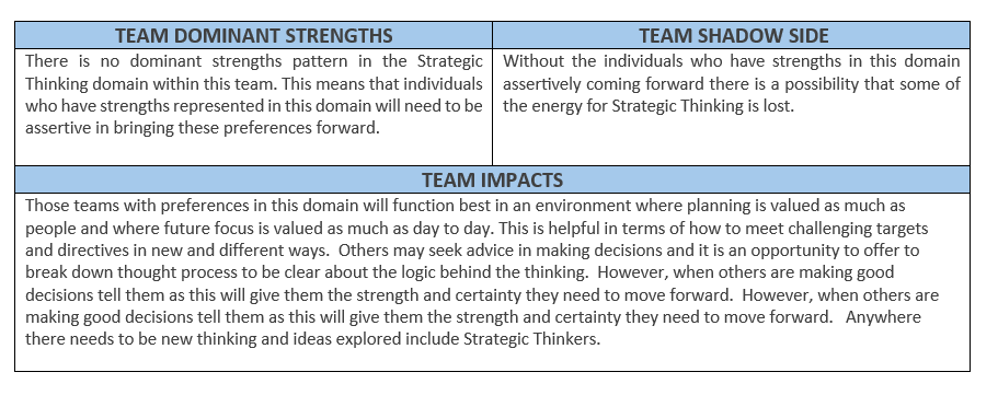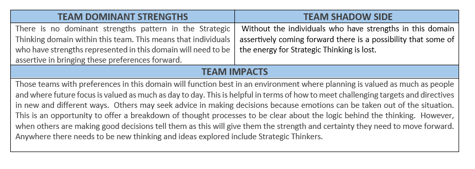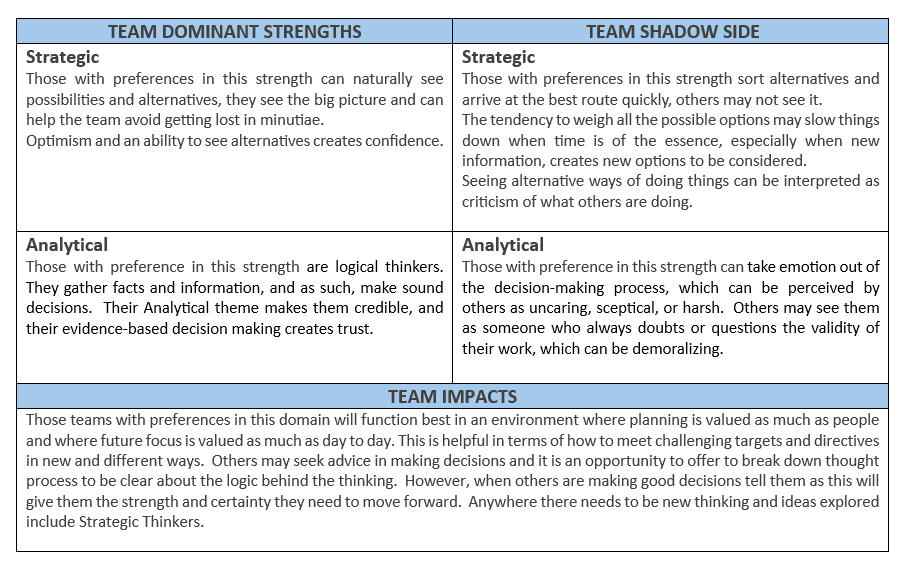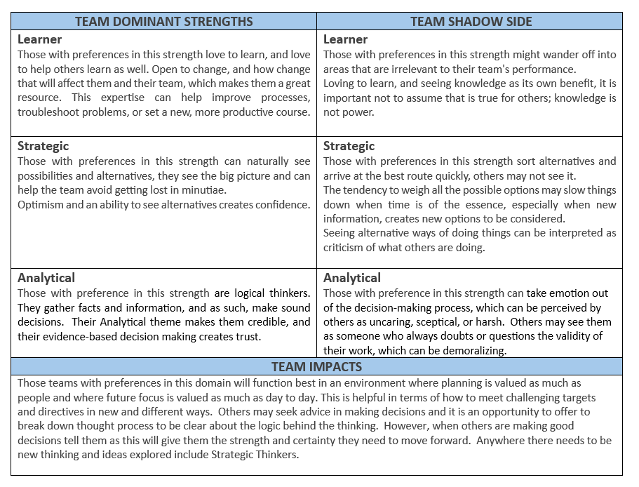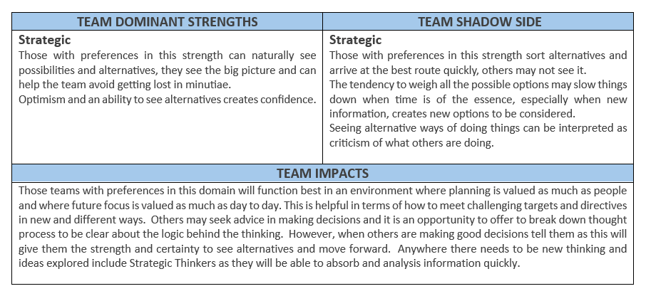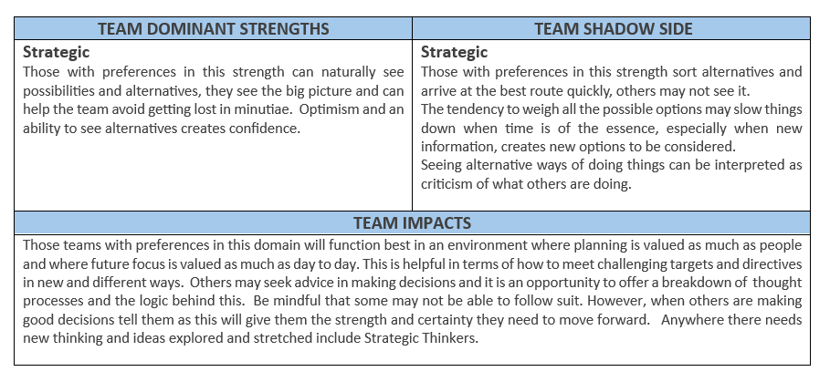 • Strategic Thinking: Teams that have a dominant strengths profile in this key domain tend to force the team/organisation to look at the big picture and toward the future – what might be. Always reviewing the data and applying what they learn, strategic thinkers move the organisation forward – stretching its members to think beyond the here and now, to the possibilities of the future.