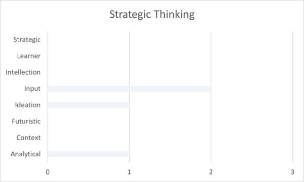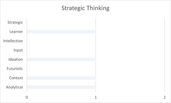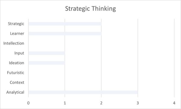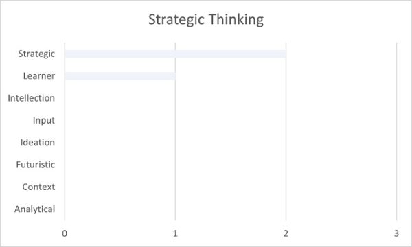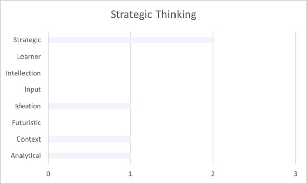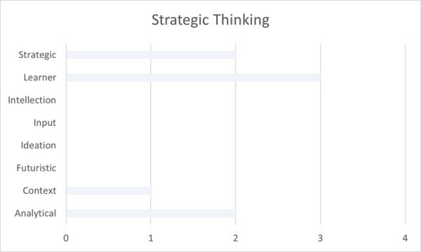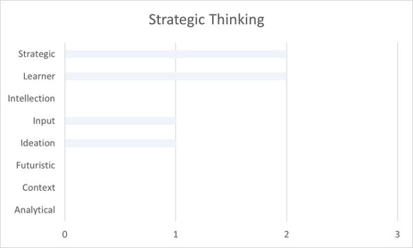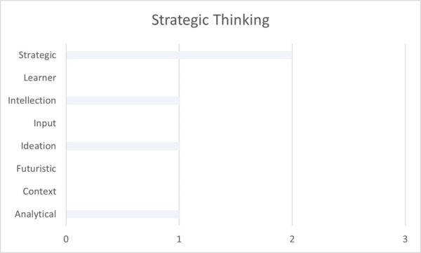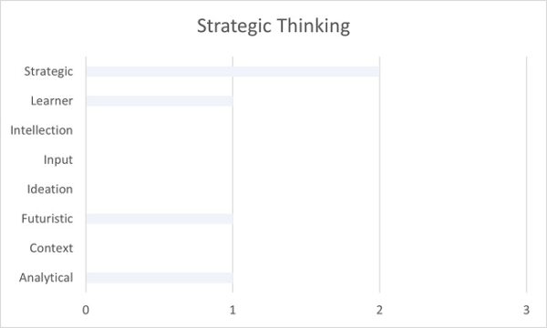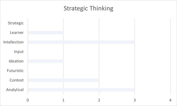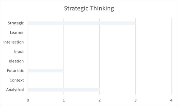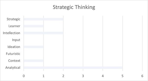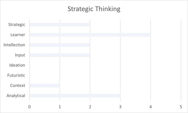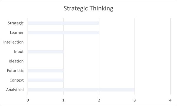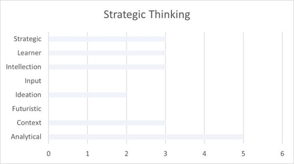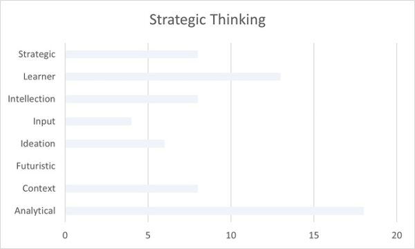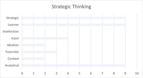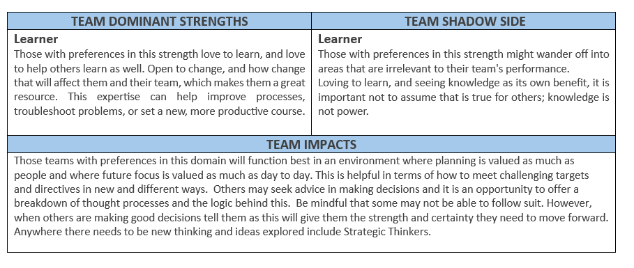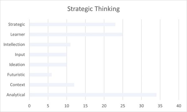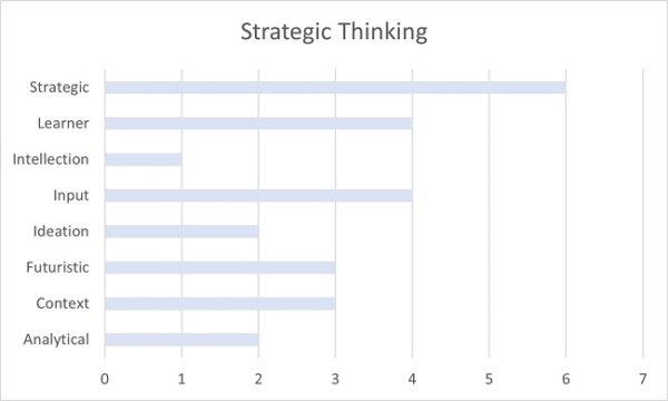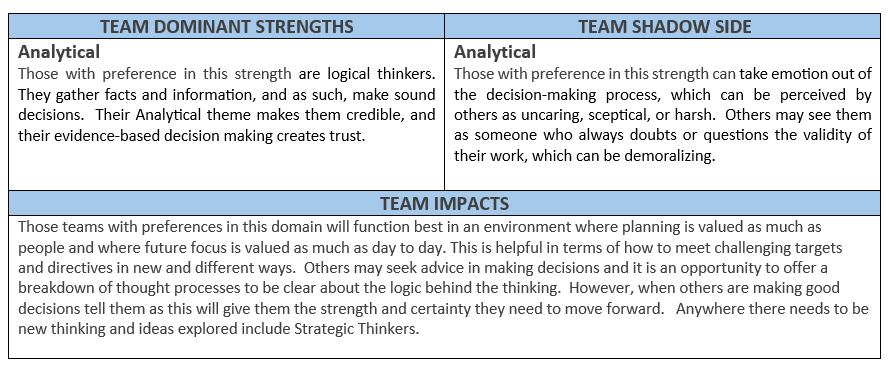• Strategic Thinking: Teams that have a dominant strengths profile in this key domain tend to force the team/organisation to look at the big picture and toward the future – what might be. Always reviewing the data and applying what they learn, strategic thinkers move the organisation forward – stretching its members to think beyond the here and now, to the possibilities of the future.