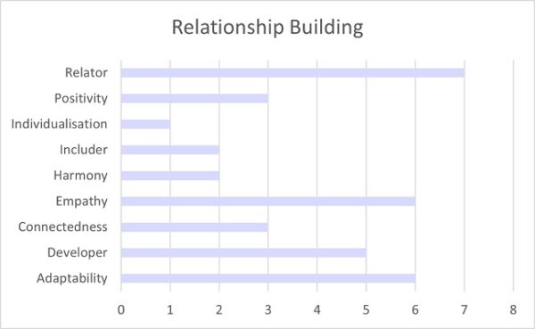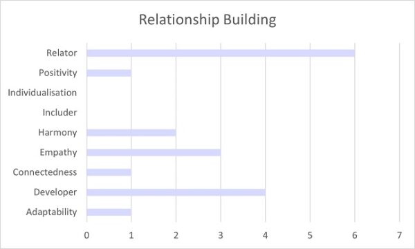 • Relationship Building: Teams that have a dominant strengths profile in this key domain tend to keep the team and wider stakeholder groups together. They’re the social glue: the mortar between the foundation building blocks. They know how to create and maintain groups such that the whole is much greater than its parts.
