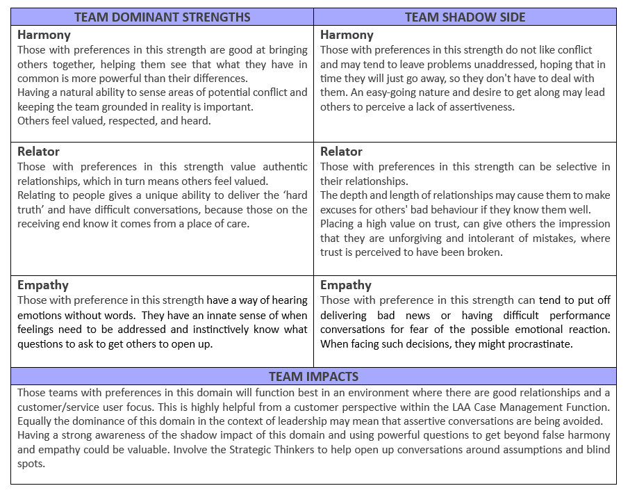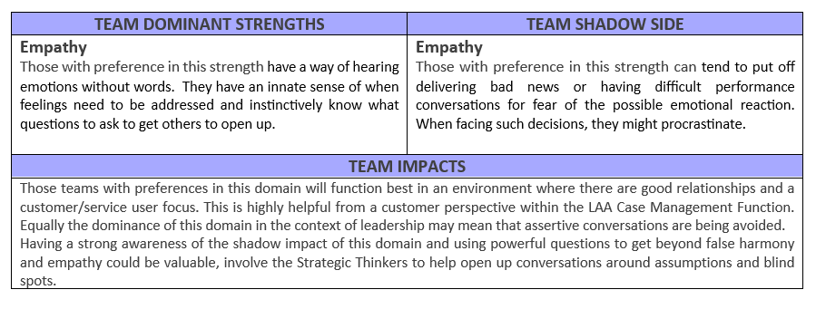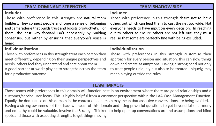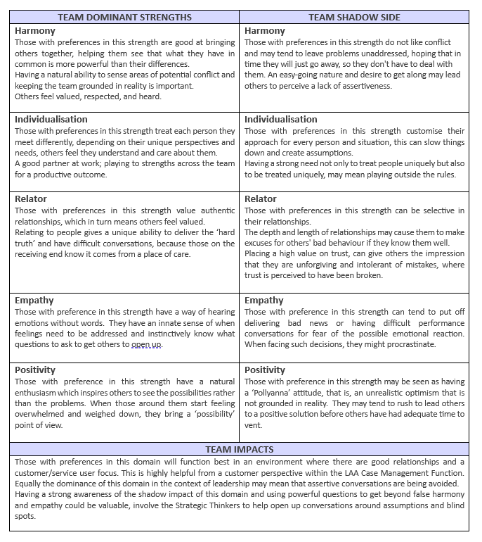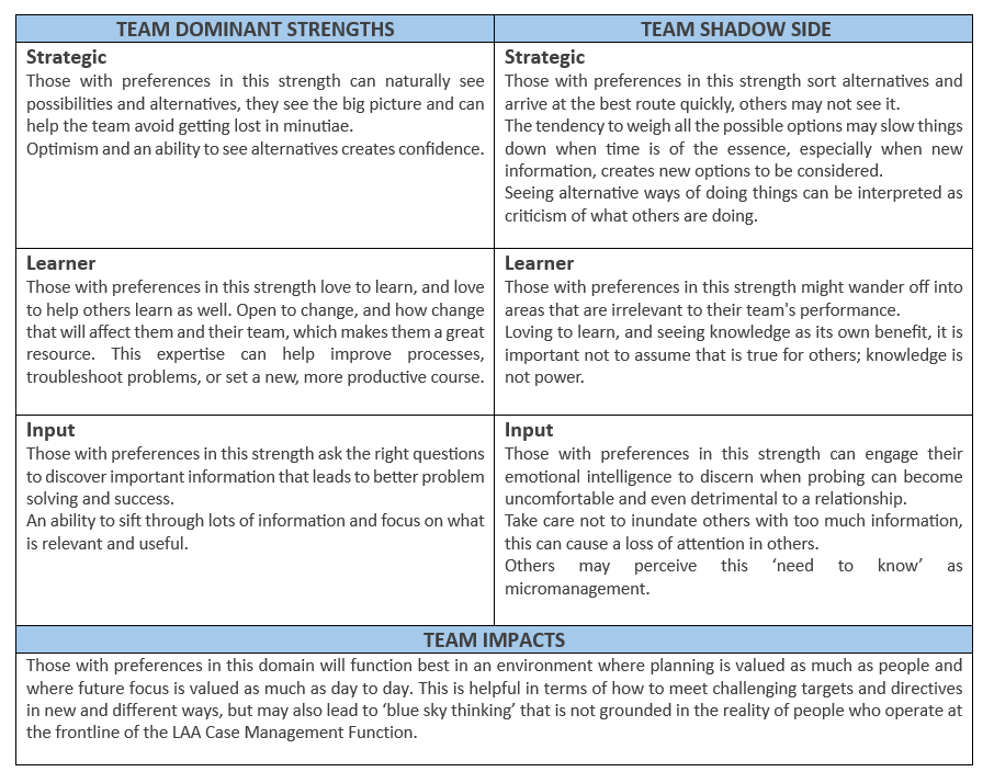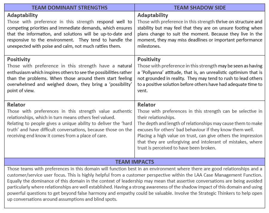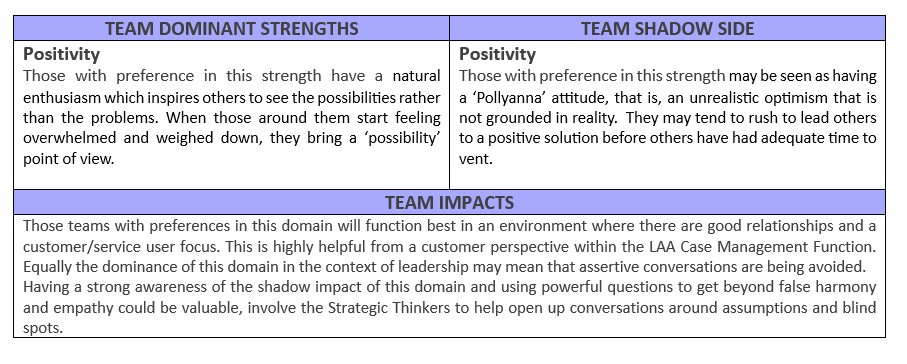 There are four domains, with 34 signature strengths presented and analysed for each team which will help to establish a universal ‘strengths’ language across the Legal Aid Case Management Function.