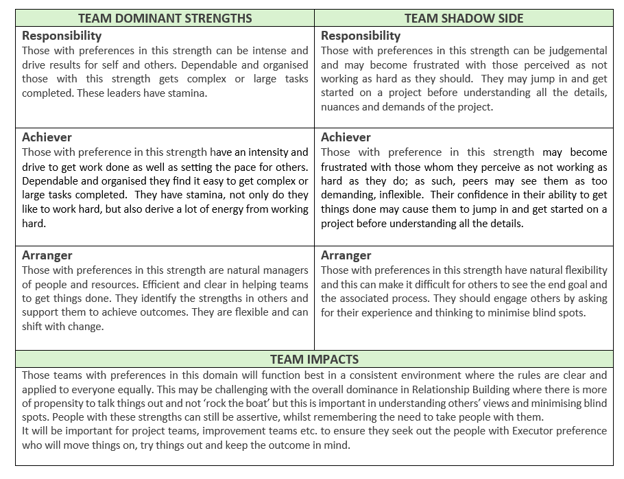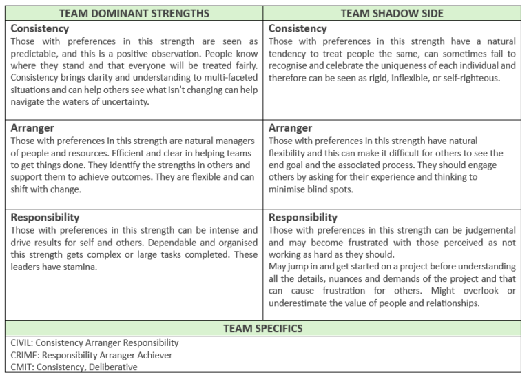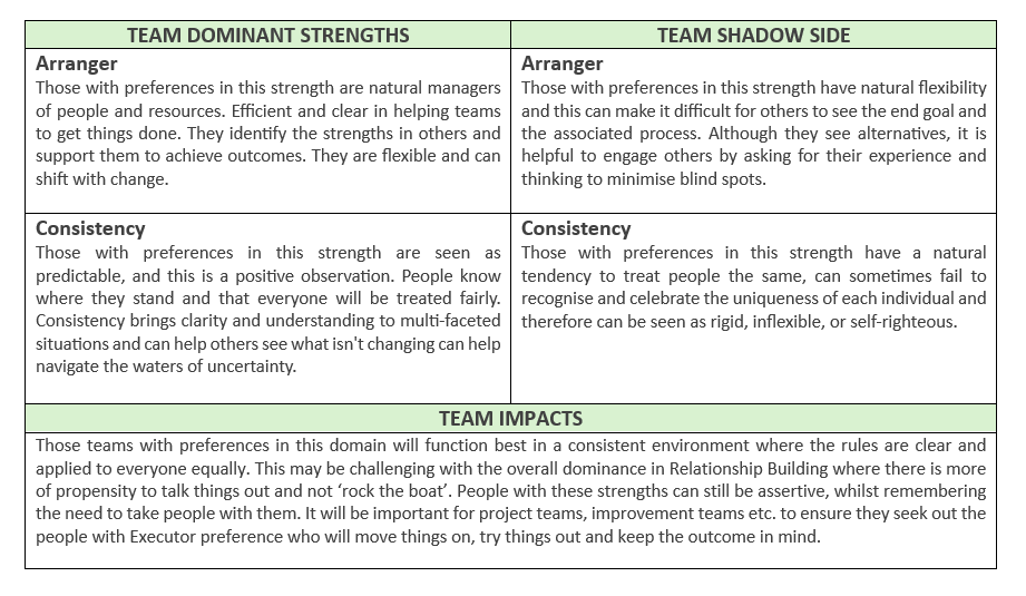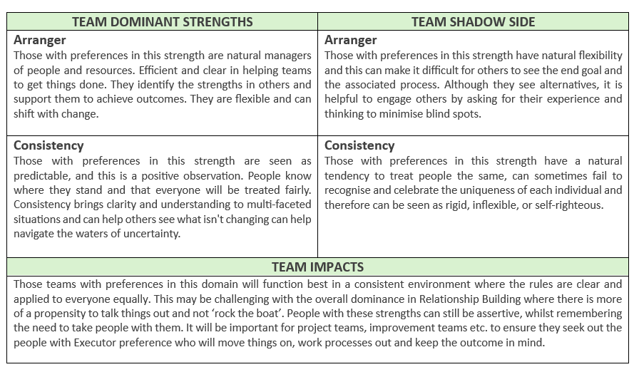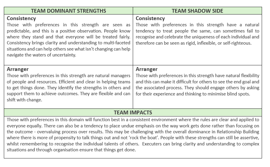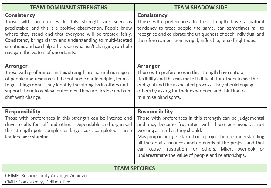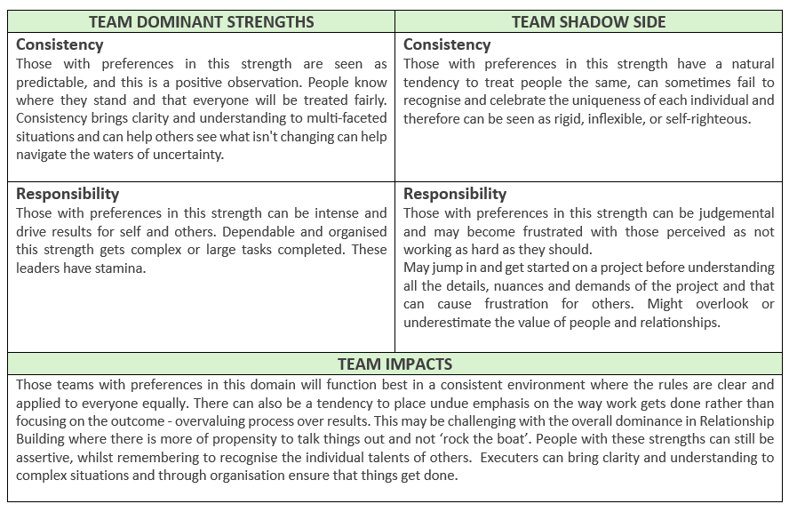 The team profile demonstrates a spread across the domain, Consistency, Arranger and Responsibility the dominant signature strengths.