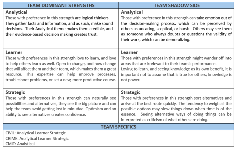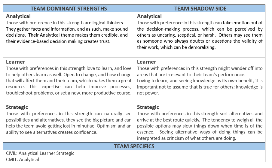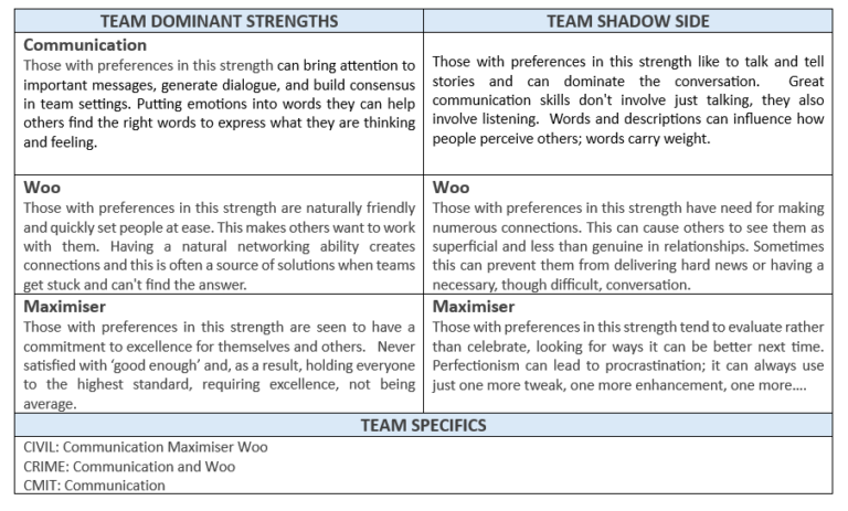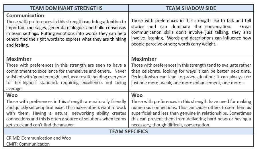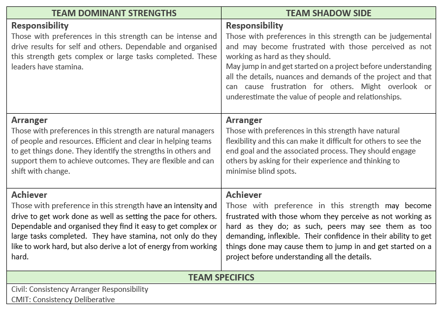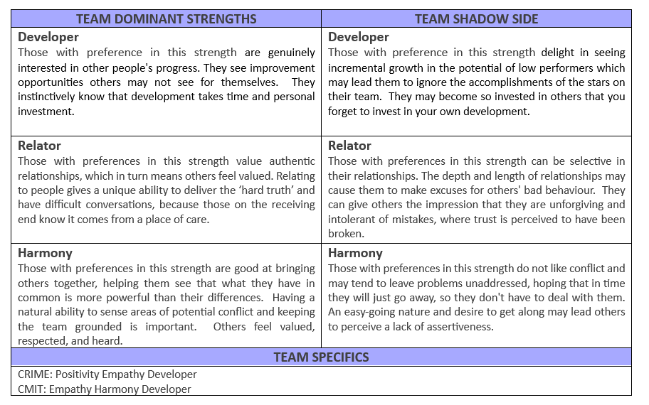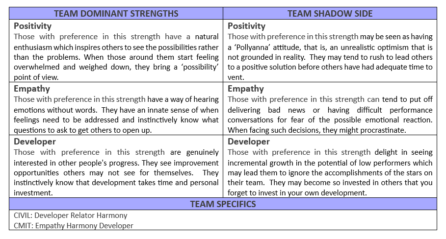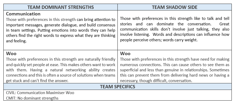 • In the Relationship Building Domain, all teams have either Empathy or Harmony (with CMIT having both) with 77% of people across the 157 people reporting one or both of these strengths.