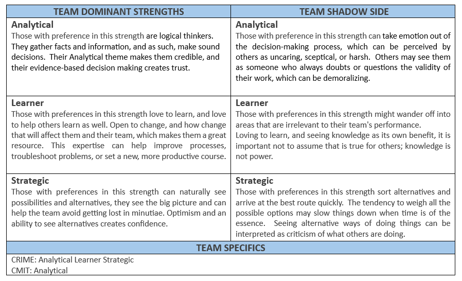 The team profile demonstrates a spread across this domain, Analytical, Learner and Strategic the dominant signature strengths.