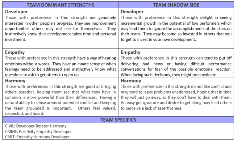 The team profile demonstrates a strong preference within this domain, Developer, Empathy, and Harmony the dominant signature strengths.