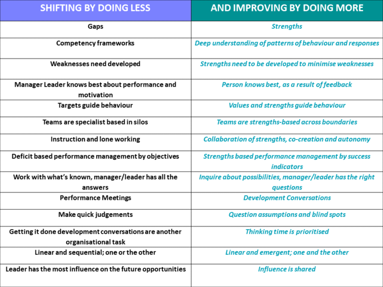Many leaders and organisations have come to the simple but powerful realisation that to get the most out of people, you must build on their strengths. And yet, though the strengths-based approach is now conventional wisdom, the tools, and systems inside organisations such as performance appraisals, mandatory training, and succession planning systems, remain stubbornly remedial and almost exclusively focused on measuring skills and knowledge, finding gaps, and attempting to plug them. The conversation is not balanced. It’s unusual to be asked, ‘How might you use your strengths to improve your customer relationships?’ and more usual to be told, ‘You need to improve how you engage with customers. I suggest XYZ training and development.’.
